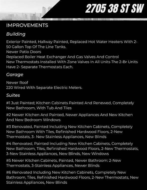 Ideal Multi-Family Investment Opportunity! Well maintained & updated 6 unit building conveniently located in Glenbrook. Comprised of 4 x 2 Bedroom and 2 x 1 Bedroom units, a maintenance room and laundry area. Located on a 77' x 116' corner lot providing ample tenant and/or visitor parking. There is a coin-a-matic laundry, adding to potential monthly revenue. All of the units have been updated or fully renovated. See photos for a list of improvements. There is a 6 space detached garage under separate title. Steps to parks, sports courts, schools and transit. Walking distance to restaurants, pharmacies and other amenities. Minutes to Mount Royal University, Westhills, all the amenities of 17th Ave W and the Downtown Core.
